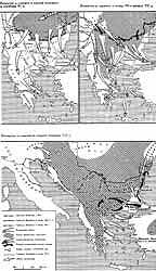 Картина резко меняется при Юстиниане. Характеризуя положение имперских дел (за период от вступления Юстиниана на престол и до середины VI в.), Прокопий с горечью пишет, что «гунны (гунно-булгары. — Ред.), склавины и анты почти ежегодно совершают набеги на Иллирик и всю Фракию, т. е. на все области от Ионийского залива (Адриатического моря. — Ред.) вплоть до предместий Константинополя, в том числе и Элладу и область Херсонеса [Фракийского]...»9. Другой современник происходивших при Юстиниане событий — Иордан — также говорит о «ежедневном упорном натиске со стороны булгар, антов и склавинов»10.